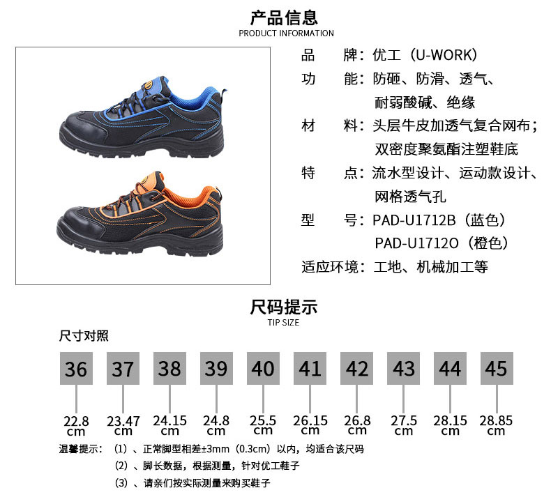优工 运动安全鞋,PAD-U1720BU-45,多彩系列防砸防刺穿安全鞋 |