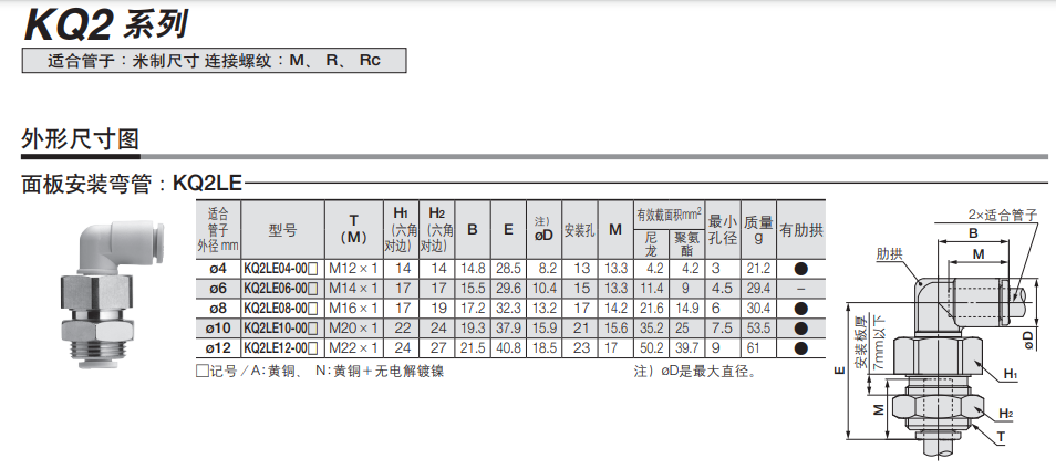SMC的气动接头SMC公制面板安装弯管,KQ2LE10-00N