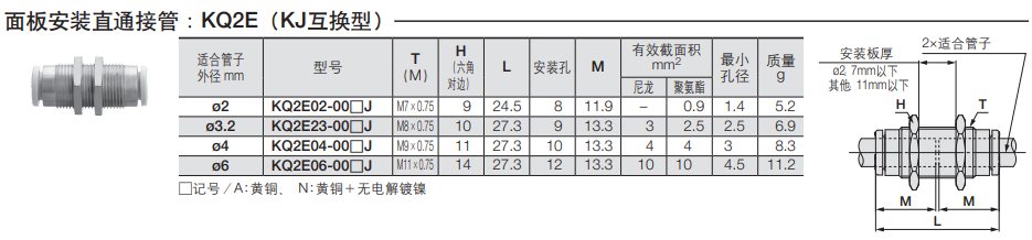 SMC的气动接头SMC公制面板安装直通接管,KQ2E02-00AJ