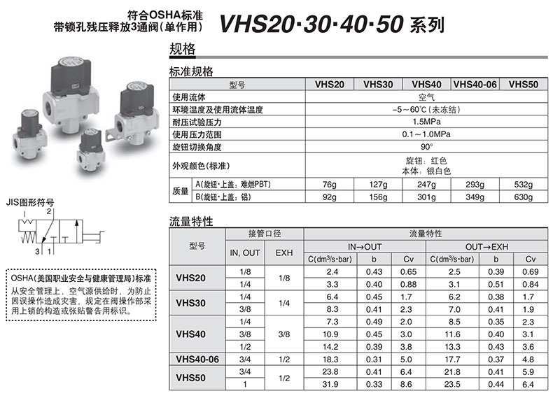 SMC 带锁孔残压释放3通手动阀,单作用型,接管口径NPT3/8,流向由右到左,单位标记psi,VHS30-N03A-RZ |