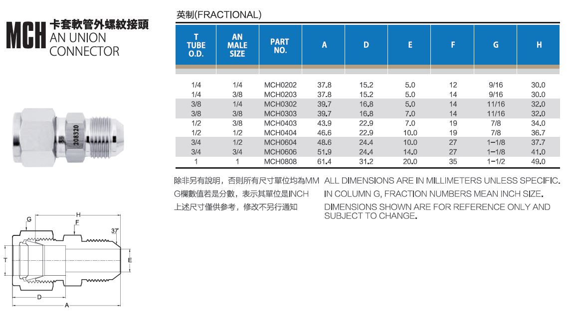 JPE D1/4"-1/4"AN卡套转软管外螺纹接头,BS6-MCH0202 |
