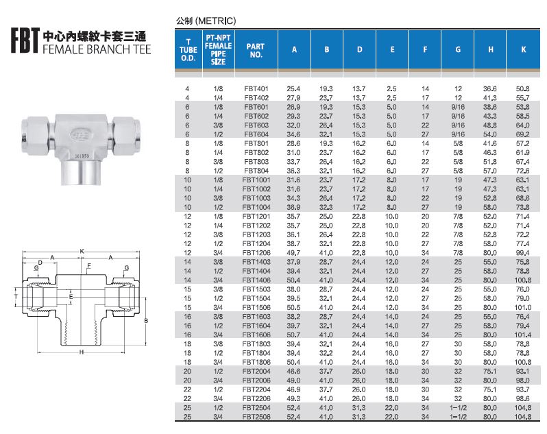 JPE的卡套接头JPED10-1/4"PT中心内牙卡套三通,BS6-FBT1002-R