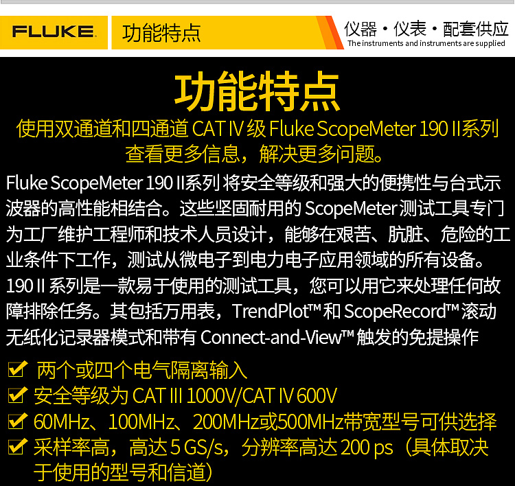 艾逊订货号:F1074628 原始型号:福禄克/FLUKE 彩色数字示波表,FLUKE-190-504/AU/S 品牌:FLUKE/福禄克 品牌所属地:中国