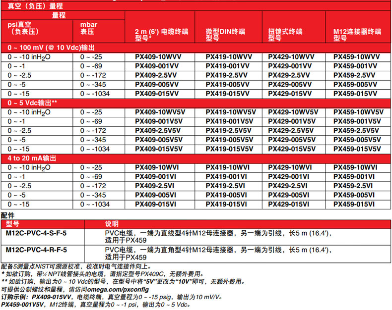 OMEGA 全不锈钢压力传感器,30psi 绝压型 DIN连接器连接 PX319-030A5V |