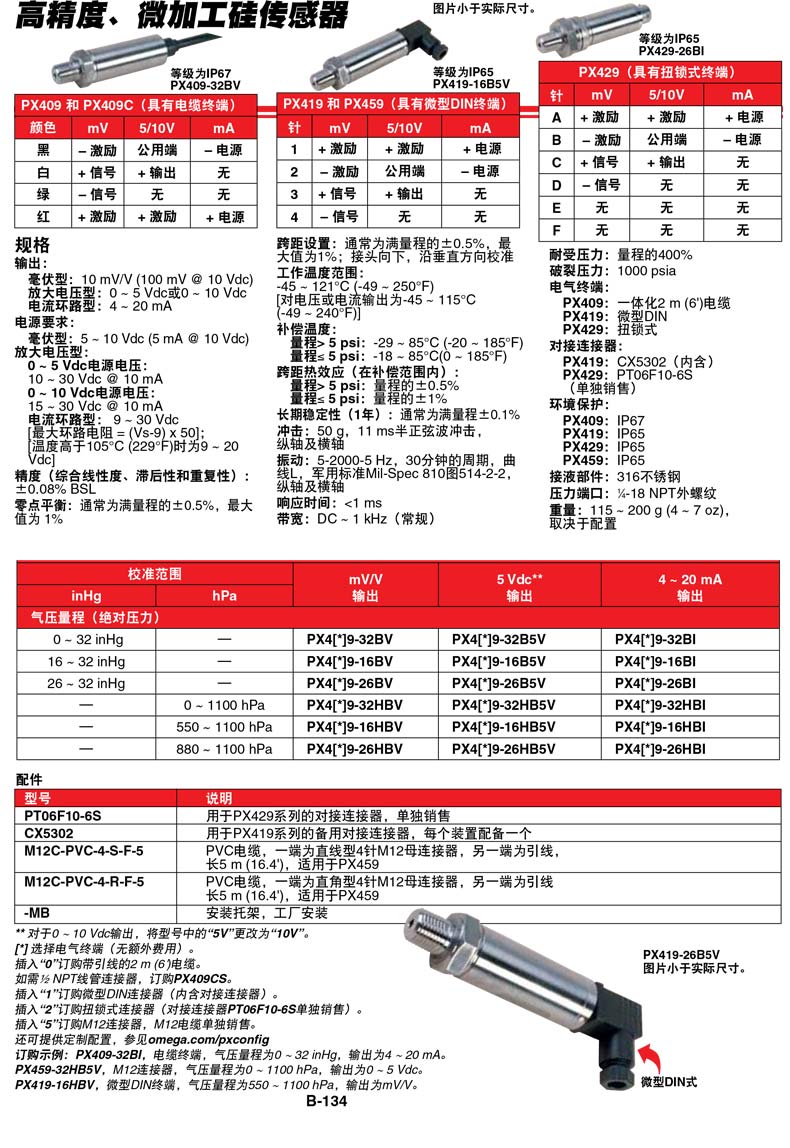 OMEGA 微加工硅高精度压力传感器,±1psi 4-20mA输出 PX409-001CGI |
