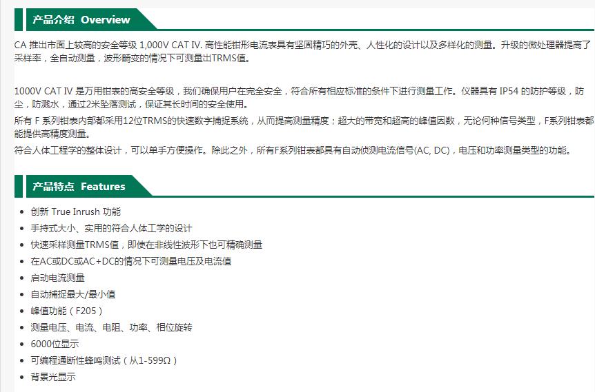 艾逊订货号:F1076407 原始型号:CHAUVIN ARNOUX/CA F205 34mm 6K位AC/DC便携TRMS/谐波/相序 品牌:CHAUVIN ARNOUX/法国CA 品牌所属地: