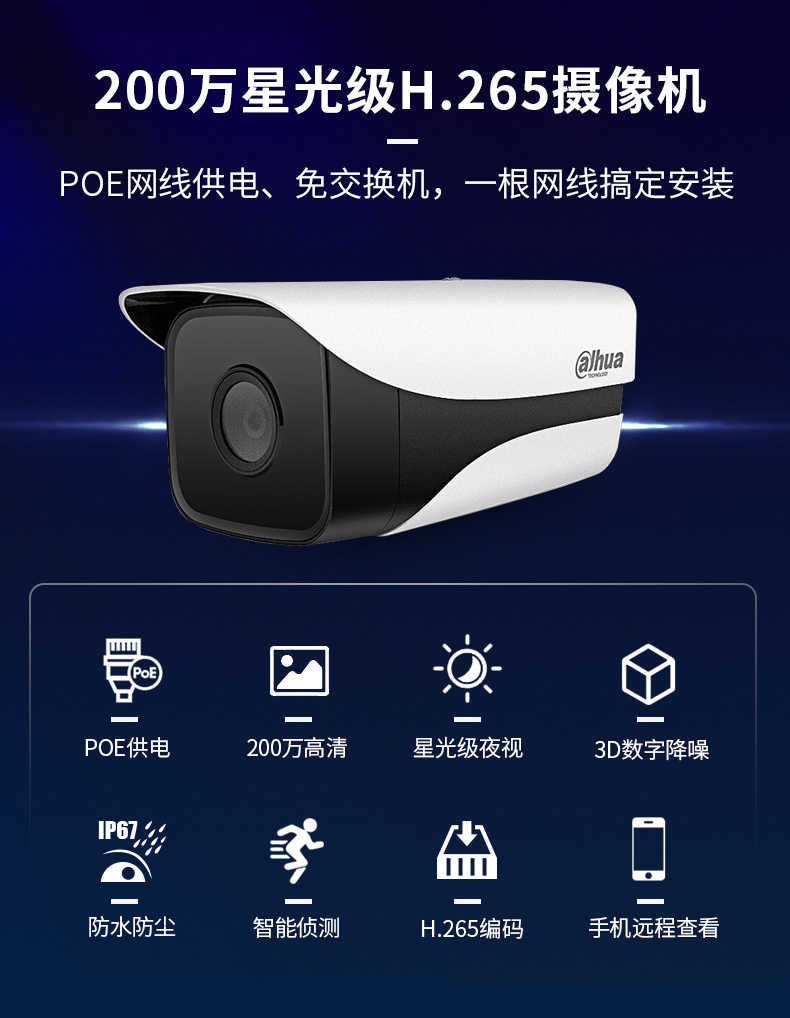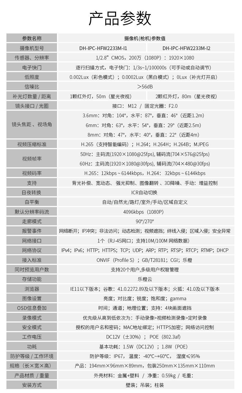 大华dahua监控摄像头200万网络枪机监控摄像头POE供电星光级双灯高清红外夜视 DH-IPC-HFW2233M-I2 镜头12MM |