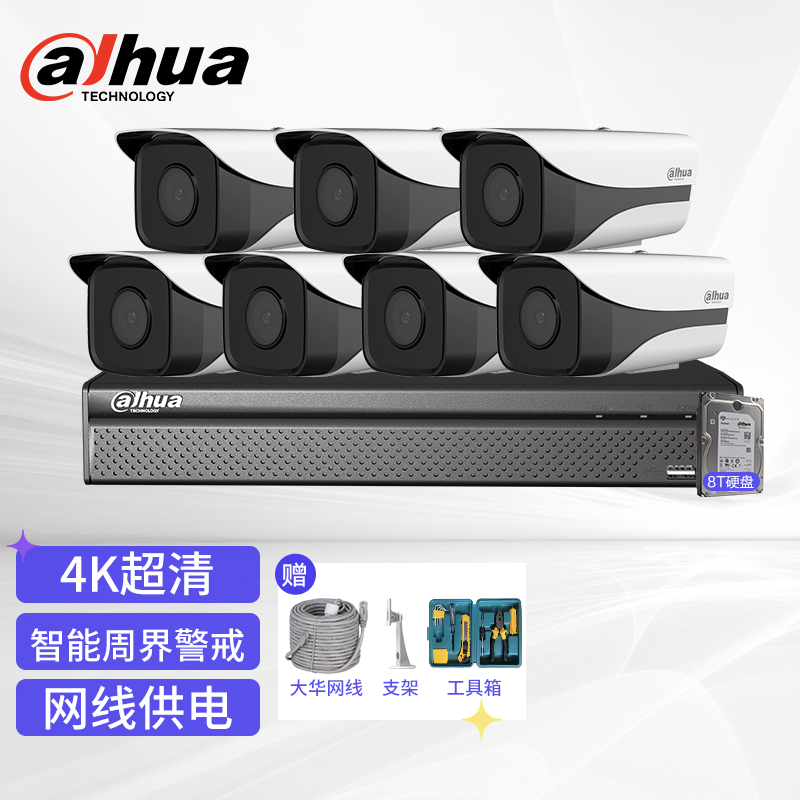大华dahua监控摄像头套装 800万网络高清摄像4K画面 POE网线供电 手机远程监控户外防尘防水监控 7路含8T硬盘 |