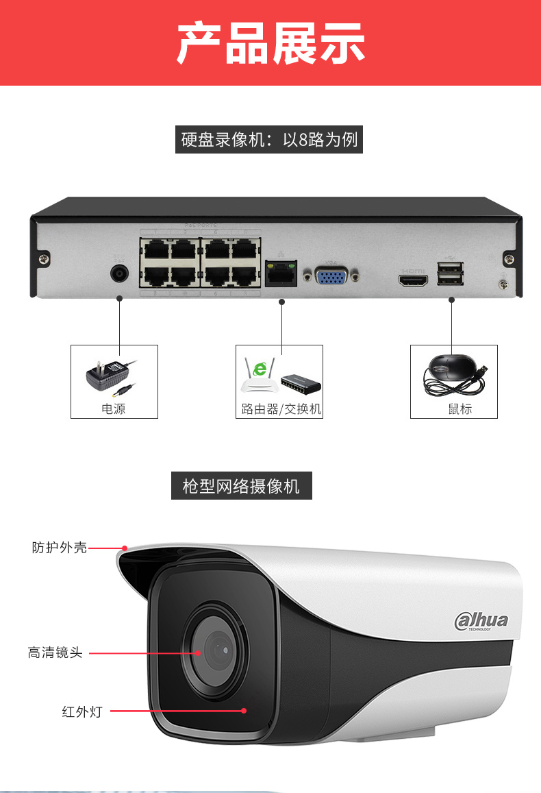 大华dahua监控摄像头套装 800万网络高清摄像4K画面 POE网线供电 手机远程监控户外防尘防水监控 5路含8T硬盘 |