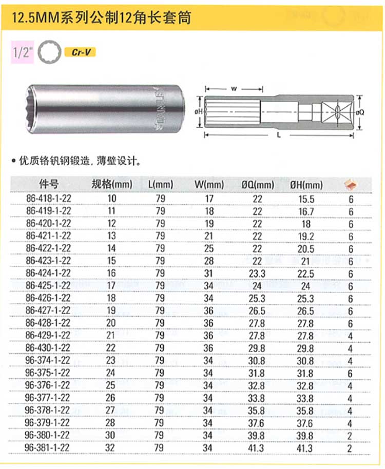 STANLEY/史丹利的套筒史丹利套筒,十二角套筒,12.5mm系列公制加长型13mm,86-421-1-22