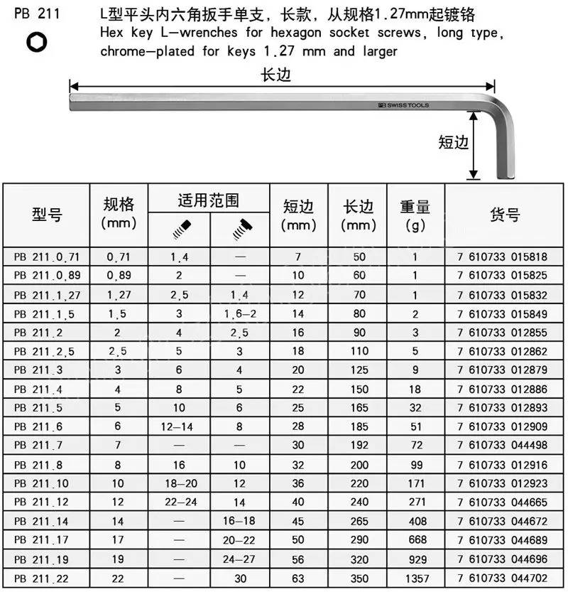 PB 瑞士工具的内六角扳手PBSWISSTOOLSL型平头加长内六角扳手,2.5mm,PB211.2,5,艾伦扳手7字扳手拐杖扳手