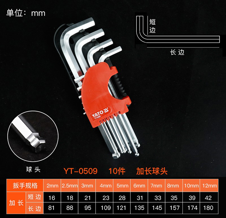 AIXUN艾逊提供YATO/易尔拓的内六角扳手套装易尔拓YATO加长球头内六角扳手组套,10件套,YT-0509