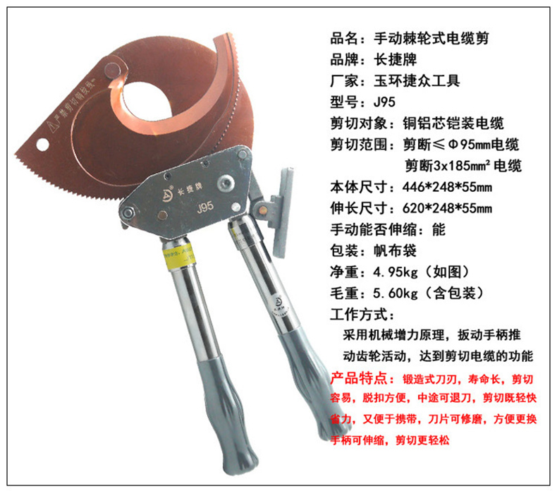 原始型号:长捷 工业棘轮式电缆钳,J95