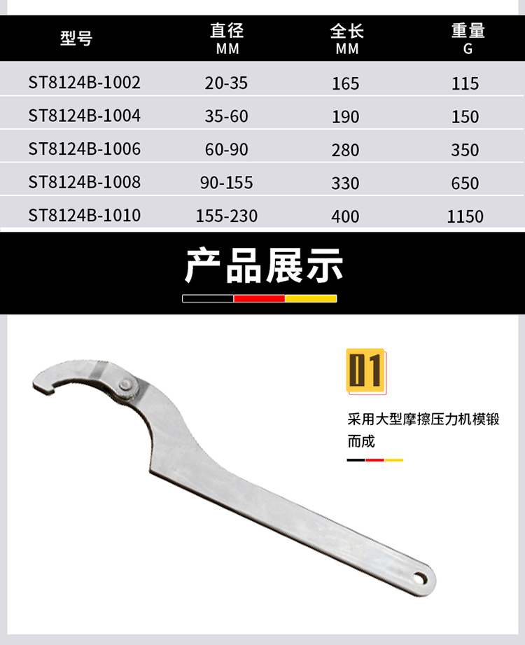 桥防304不锈钢可调勾扳手,155-230mm,T88124B-10 |