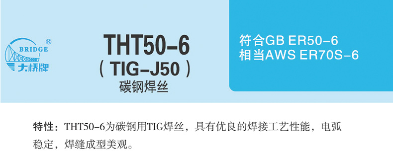 艾逊订货号:D1022824 原始型号:大桥牌碳钢直条氩弧焊丝THT50-6(TIJ-J50),φ2.0,ER50-6,20公斤/箱 品牌:BRIDGE/大桥 品牌所属地: