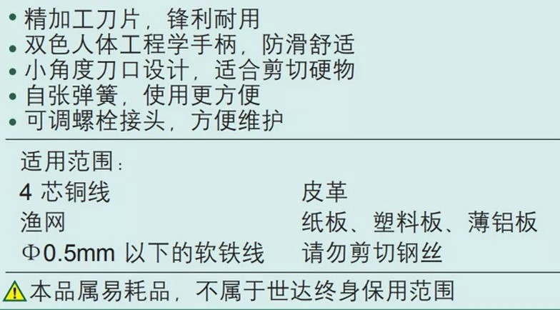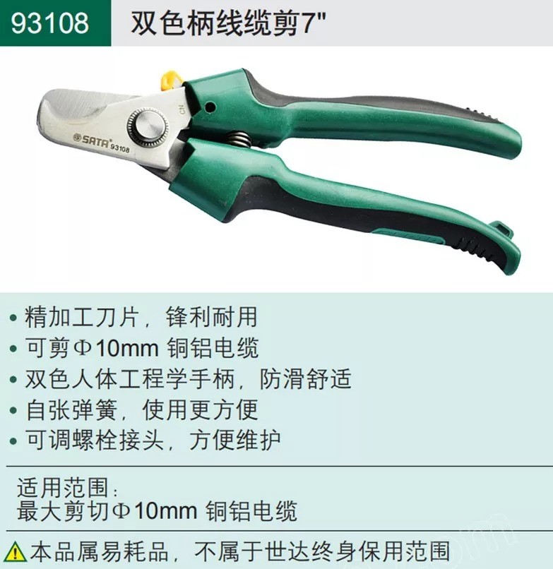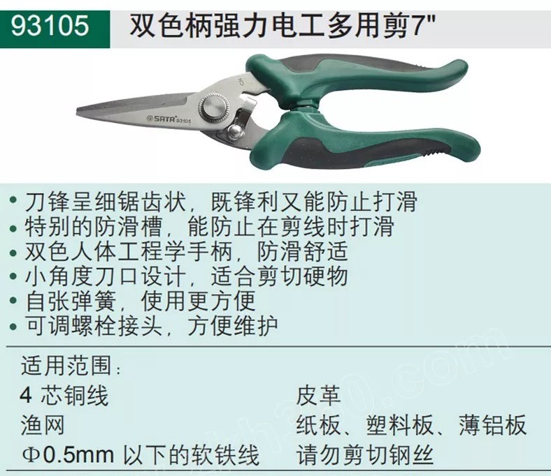艾逊订货号:D1031402 原始型号:世达 双色柄强力电工多用剪7”,93105 品牌:SATA/世达 品牌所属地: