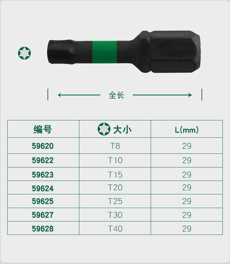 艾逊订货号:D1036511 原始型号:世达抗冲击花形旋具头,29MM长 10支装 T10,59622 品牌:SATA/世达 品牌所属地:中国