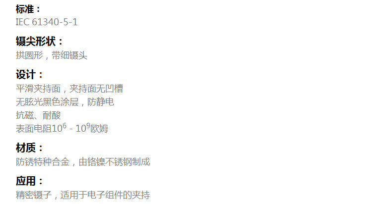 艾逊订货号:D1036719 原始型号:SMD镊子,防静电表面贴装镊子 长117mm,32344 品牌:Wiha/威汉 品牌所属地:中国