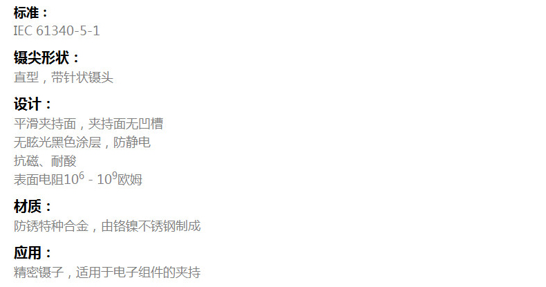 艾逊订货号:D1036720 原始型号:威汉防静电镊子,光滑尖爪型 长110mm,32334 品牌:Wiha/威汉 品牌所属地:中国
