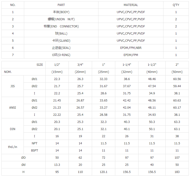 环琪 VP640型UPVC双由令球阀,牙口式,密封EPDM,1+1/2'',DN40,BSPT螺纹 |