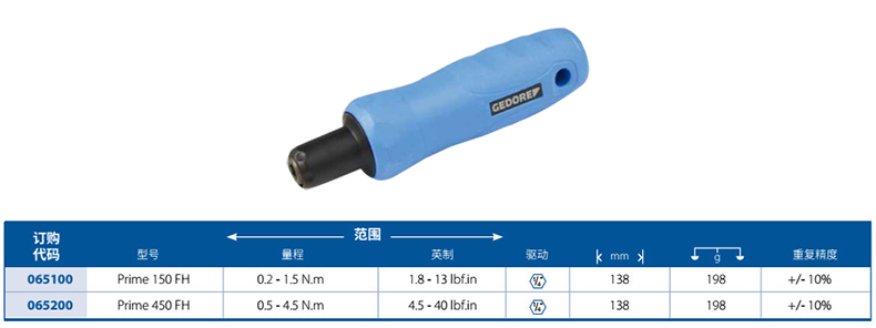 吉多瑞 预设式扭矩螺丝刀,2.5-13.5N.m,1/4"(6.35mm)六角夹头,065700,PRO 1350 FH |
