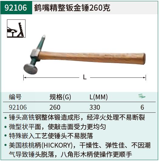 艾逊订货号:D1041986 原始型号:世达精整钣金锤,260g鹤嘴,92106 品牌:SATA/世达 品牌所属地: