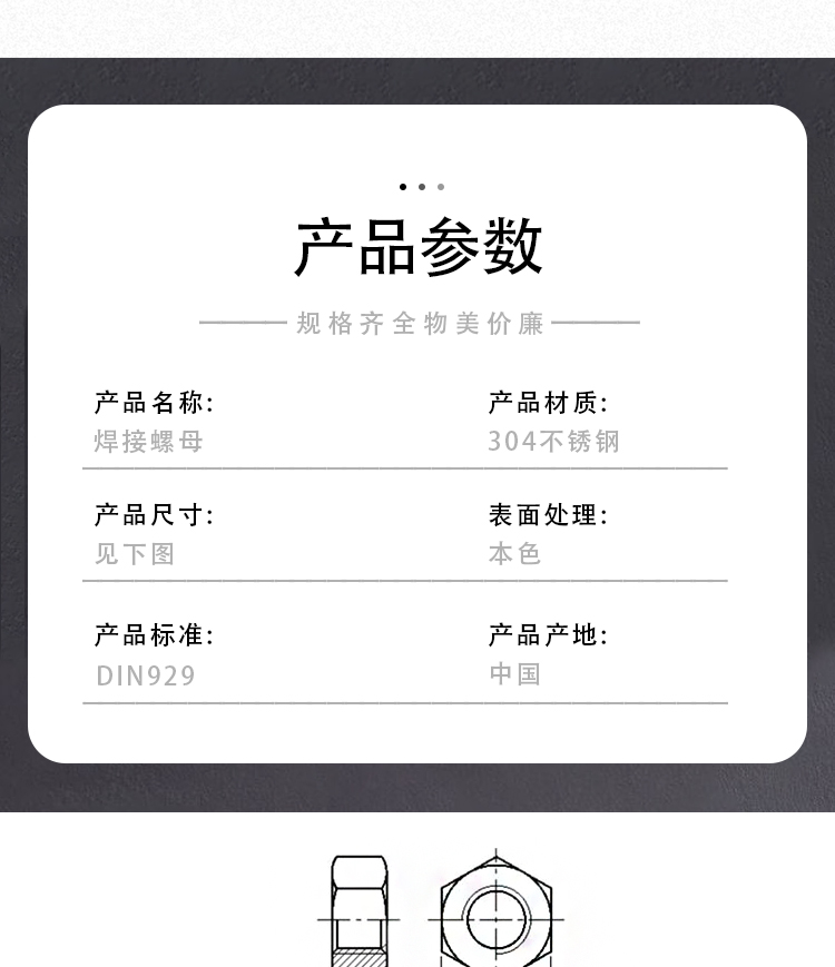 艾逊订货号:G1037272 原始型号:奥峰 DIN929六角焊接螺母,M8-1.25,不锈钢304 品牌:AOFENG/奥峰 品牌所属地:中国