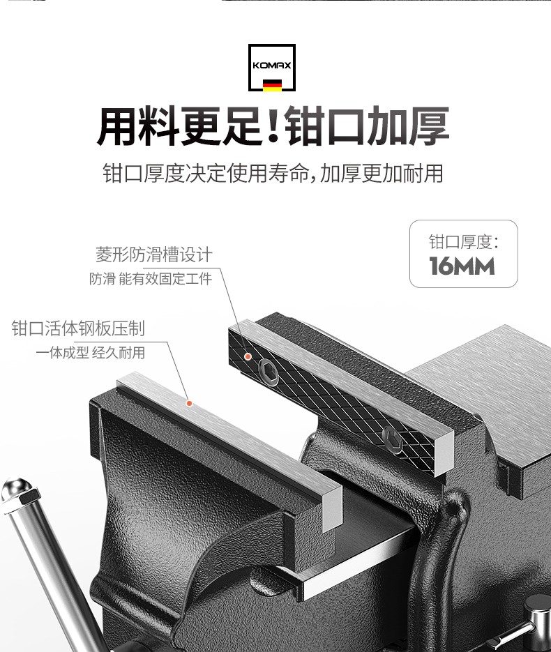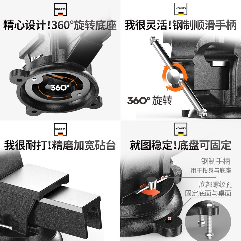 艾逊订货号:D1042139 原始型号:科麦斯工业级重型台虎钳多功能夹钳虎台钳精密平口钳桌虎台钳工作台家用 8寸重型活动带砧台虎钳 品牌:科麦斯 品牌所属地:德国