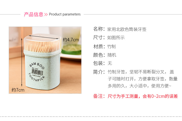 艾逊订货号:K1024060 原始型号:劳保佳 盒装牙签 创意方盒简装牙签 一次性竹制双头酒店饭馆牙签 混色 250支/盒 10盒装 品牌:劳保佳 品牌所属地:中国