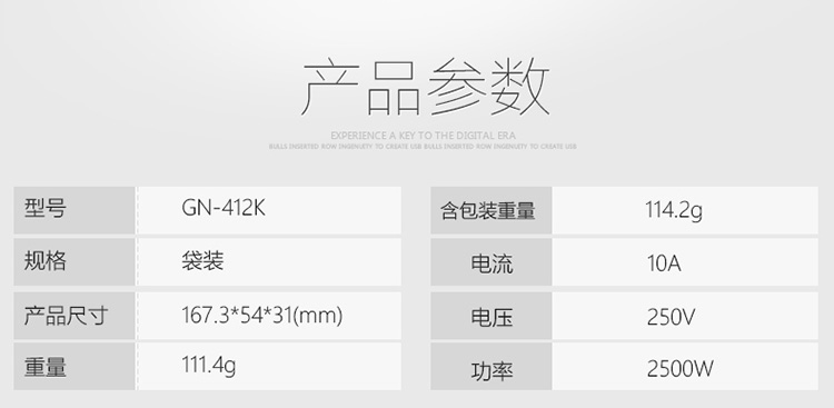 艾逊订货号:E1069675 原始型号:公牛 GN-412K 无电线 品牌:BULL/公牛 品牌所属地:中国