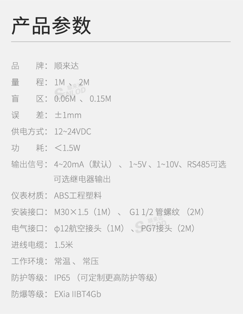 艾逊订货号:F1078373 原始型号:顺来达(SENLOD) Senlod一体式超声波液位计/物位仪小盲区超声波液位计 高精度 【选装】继电器功能加价 品牌:SENLOD/顺来达 品牌所属地:中国