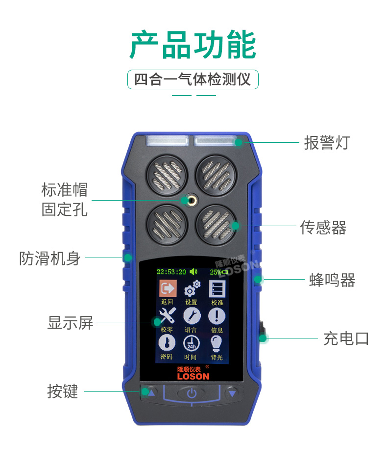 艾逊订货号:F1078607 原始型号:隆顺 四合一气体检测仪一氧化碳\/可燃气硫化氢报警器氧气EM-4有毒气体 品牌:LOSON/隆顺 品牌所属地:中国