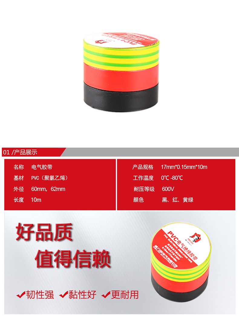 艾逊订货号:K1024857 原始型号:德力西电气电胶布 绝缘防水胶带 电工胶布电工配件防触电PVC电气胶带10m 20米 黑色 加粘型 品牌:DELIXI/德力西 品牌所属地:中国