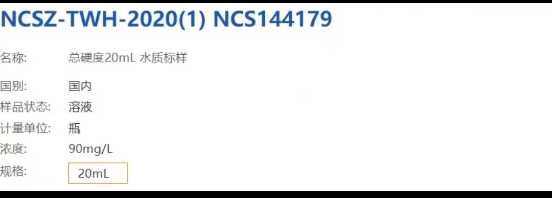 艾逊订货号:H1009197 原始型号:NCS/钢研纳克 总硬度水质标样 NCSZ-TWH-2020(1) 浓度90mg/L 20mL 安瓿瓶 1瓶 品牌:NCS/钢研纳克 品牌所属地:中国