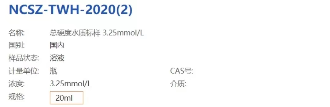 艾逊订货号:H1009198 原始型号:NCS/钢研纳克 总硬度水质标样 NCSZ-TWH-2020(2) 浓度3.25mmol/L 20mL 塑料瓶 1瓶 品牌:NCS/钢研纳克 品牌所属地:中国
