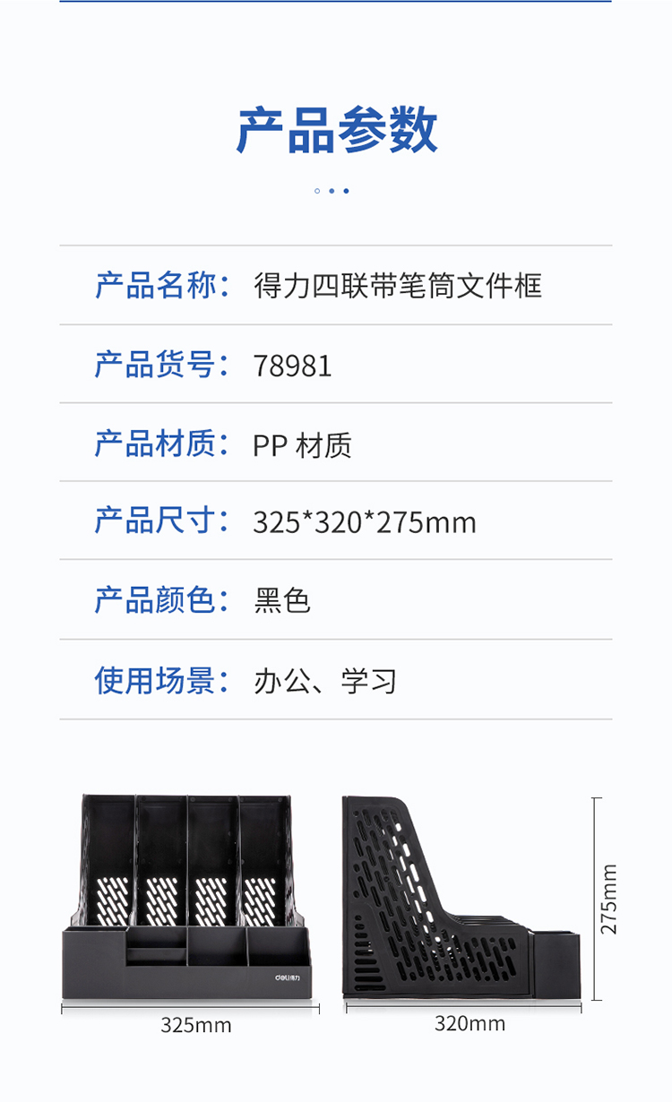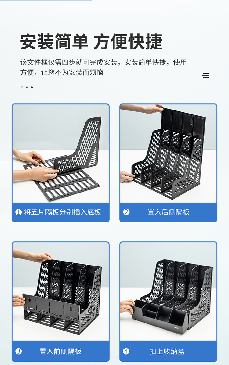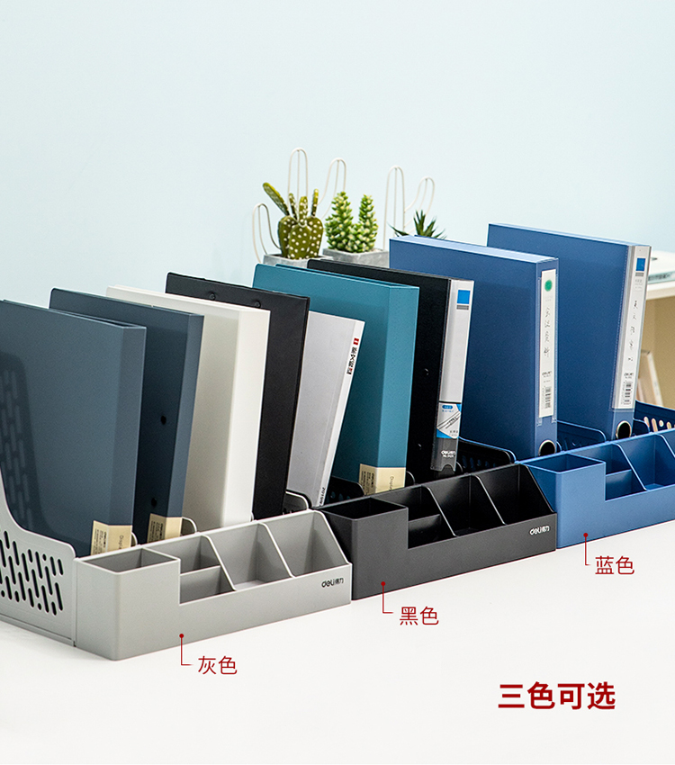 得力(deli)四联带笔筒收纳桌面文件框 多功能镂空文件栏/文件框/资料筐 蓝色78981 |