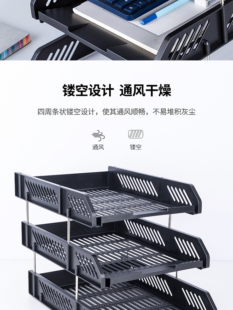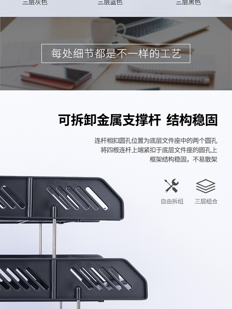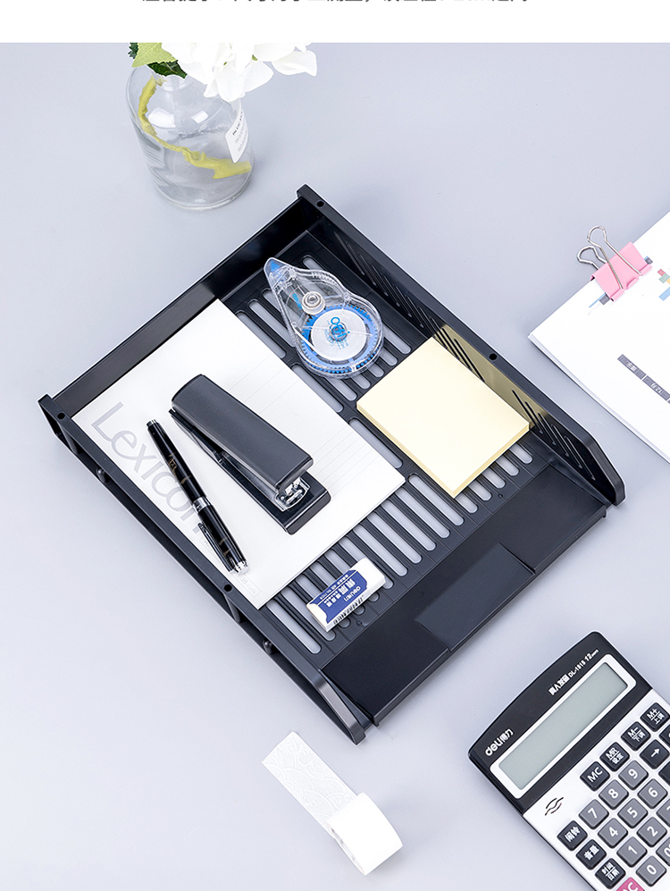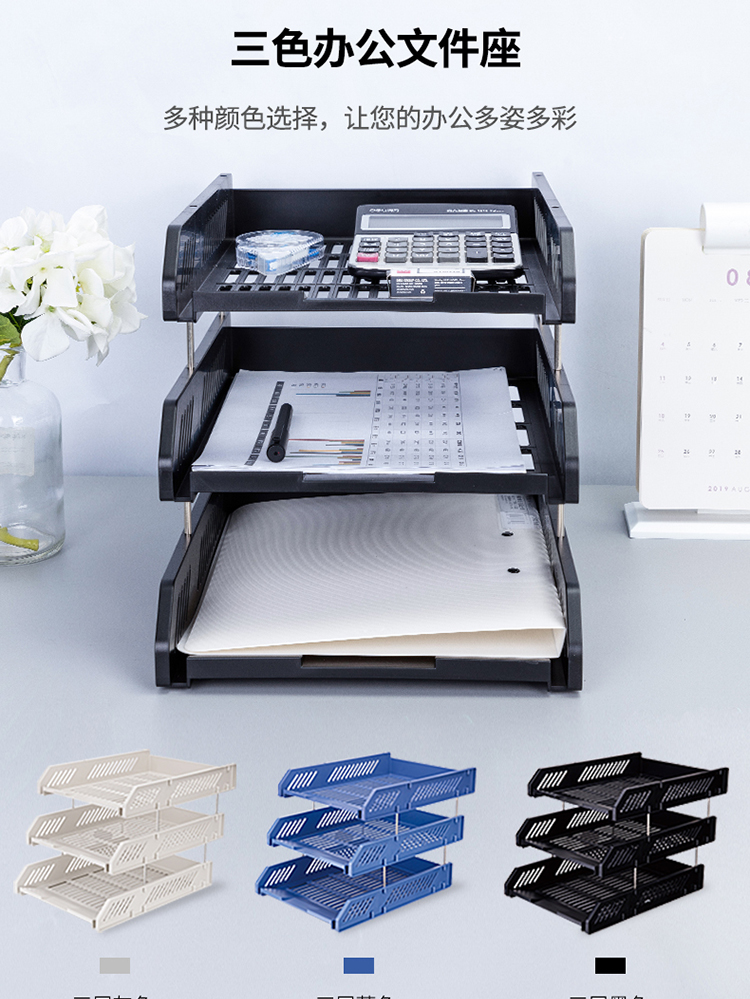 得力(deli)三层镂空收纳文件座 自由拆卸组装三层文件盘/文件框 灰色9209 |