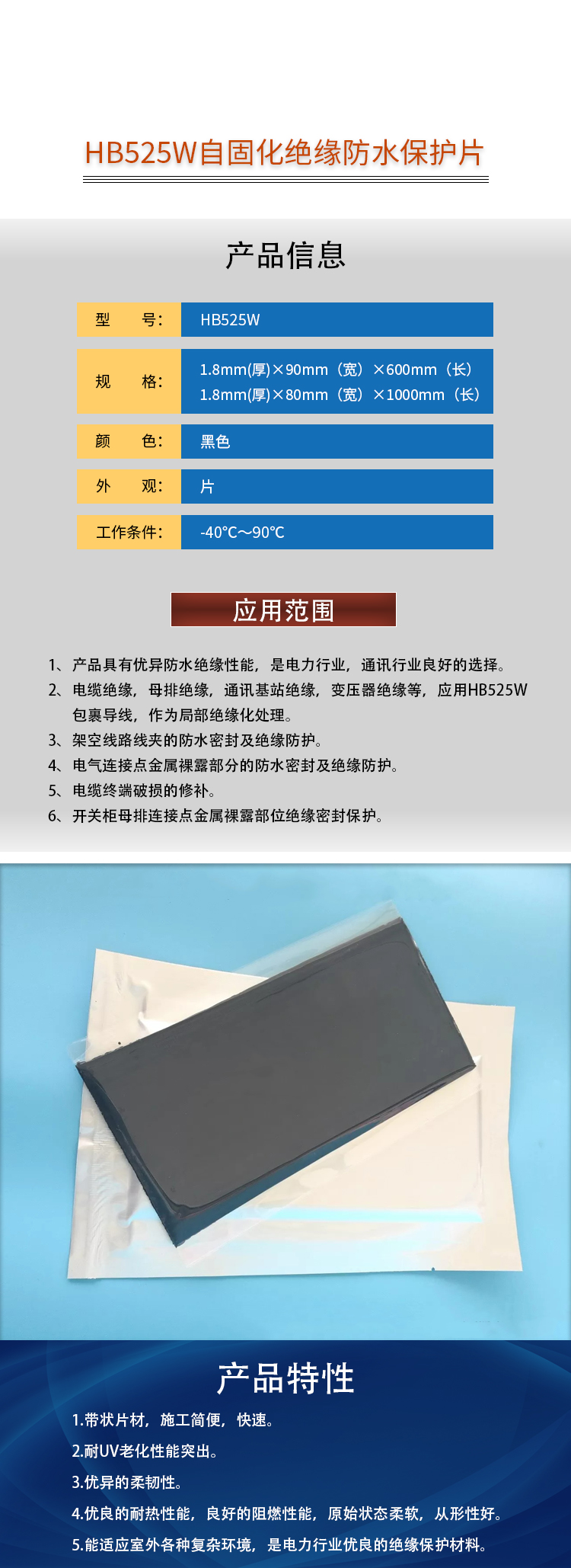 艾逊订货号:H1009257 原始型号:casac/中科应化HB525W"自固化绝缘防水保护片(黑色)"1.8mm*90mm*600mm 品牌:casac/中科应化 品牌所属地:中国