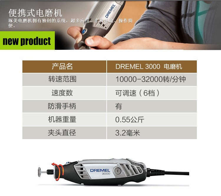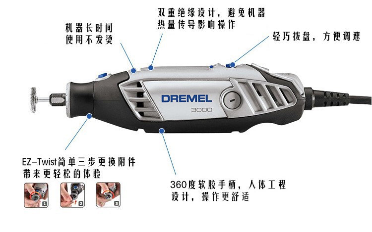 艾逊订货号:D1042526 原始型号:DREMEL/琢美 电磨机 3000 2/30 F0133000RB 品牌:DREMEL/琢美 品牌所属地:国产