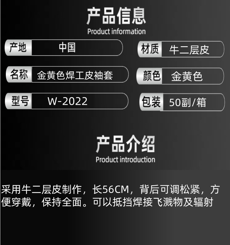 艾逊订货号:J1027894 原始型号:W-2022 金黄色.长56CM. 焊工皮袖套.防烫、耐磨、防割、防穿刺、防飞溅物、火花 品牌:威仕盾 品牌所属地:中国